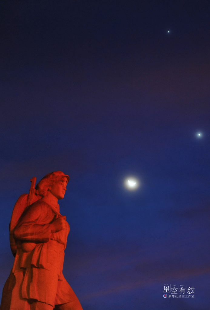 这是2012年7月16日凌晨在海南省琼海市拍摄的红色娘子军雕像上空的金木合月天象。新华社发(蒙钟德 摄)