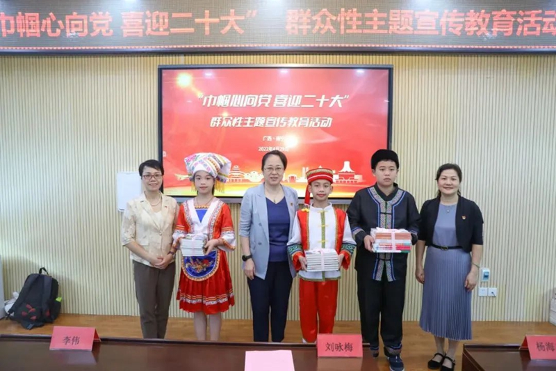 广西“巾帼心向党 喜迎二十大”群众性主题宣传教育活动走进南宁市新兴民族学校。广西民族团结进步模范个人、南宁市新兴民族学校校长吴鸿丽围绕“铸牢中华民族共同体意识”,广西三八红旗手、壮绣文化传承人蓝淋以“壮绣文化传承”为主题,作了宣讲。