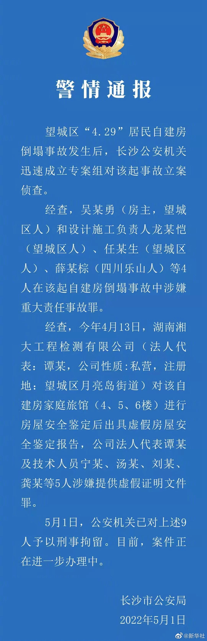 长沙警方1日通报,长沙市望城区“4.29”居民自建房倒塌事故发生后,长沙公安机关迅速成立专案组对该起事故立案侦查。经查,吴某勇(房主,望城区人)和设计施工负责人龙某恺(望城区人)、任某生(望城区人)、薛某棕(四川乐山人)等4人在该起自建房倒塌事故中涉嫌重大责任事故罪。经查,今年4月13日,湖南湘大工程检测有限公司对该自建房家庭旅馆(4、5、6楼)进行房屋安全鉴定后出具虚假房屋安全鉴定报告,公司法人代表谭某及技术人员宁某、汤某、刘某、龚某等5人涉嫌提供虚假证明文件罪。5月1日,公安机关已对上述9人予以刑事拘留。目前,案件正在进一步办理中。(记者刘良恒、谭畅)