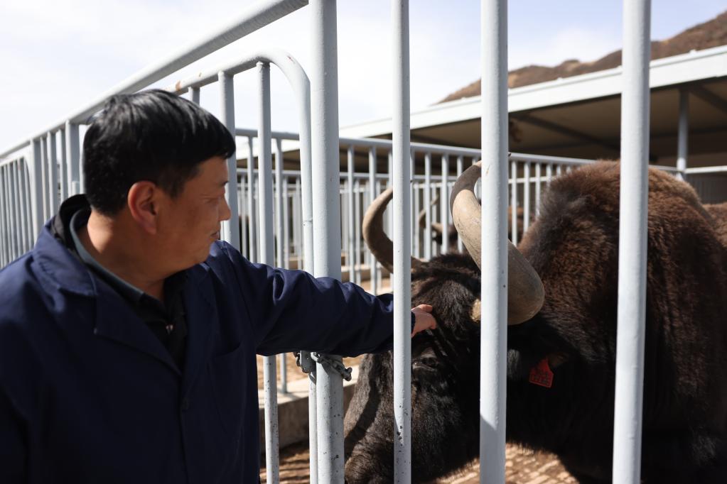 3月28日,在青海省大通种牛场,殷满财正在抚摸“尕66”的毛发。(新华社记者 李宁摄)