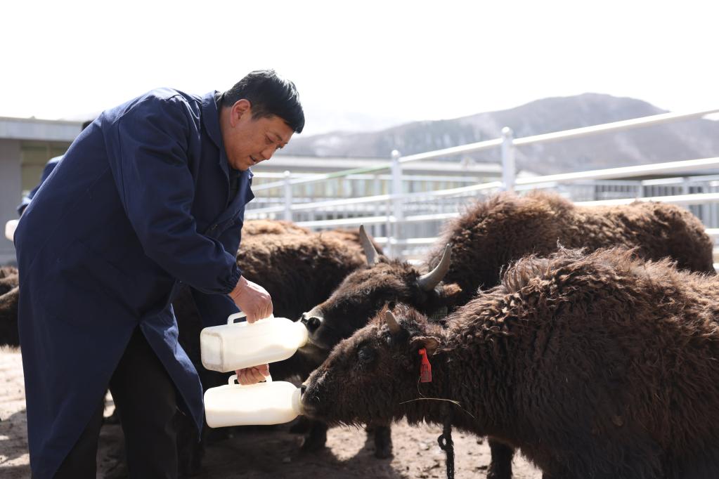 3月28日,在青海省大通种牛场,殷满财正在给出生不满一岁的牦牛喂奶。(新华社记者 李宁摄)