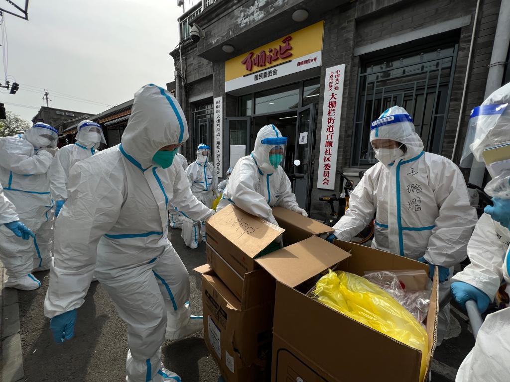 西城区大栅栏街道防疫人员为辖区居民筹备保障物资。西城区大栅栏街道供图