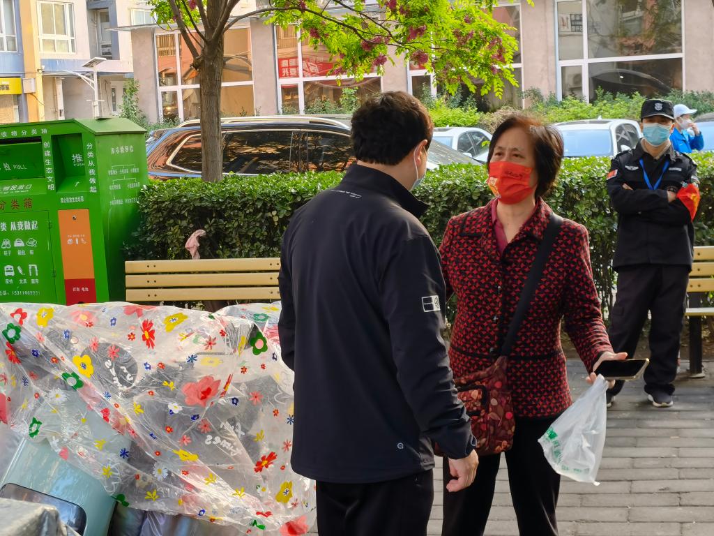 朝阳区劲松街道百环东社区党委书记张明宇在为群众答疑释惑。 新华社记者 李嘉盈 摄