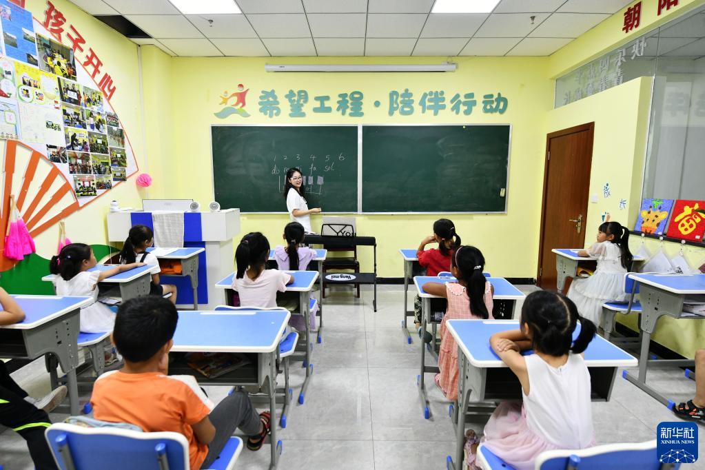 在贵州省思南县双塘街道丽景社区易地扶贫搬迁安置点,大学生志愿者给孩子们上音乐课(2020年8月13日摄)。新华社记者 杨文斌 摄