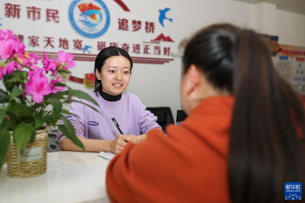 5月1日,西部计划志愿者车佳桃(左)在贵州省铜仁市玉屏侗族自治县新店镇丙溪村活动室接待村民咨询产业发展问题。新华社发(胡攀学 摄)