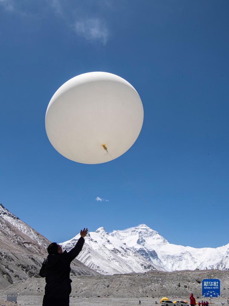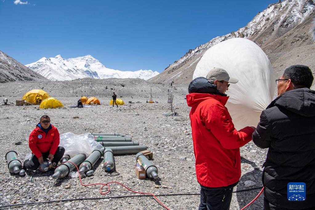 在珠峰登山大本营,科研人员施放大气臭氧探空气球(5月3日摄)。新华社记者 孙非 摄