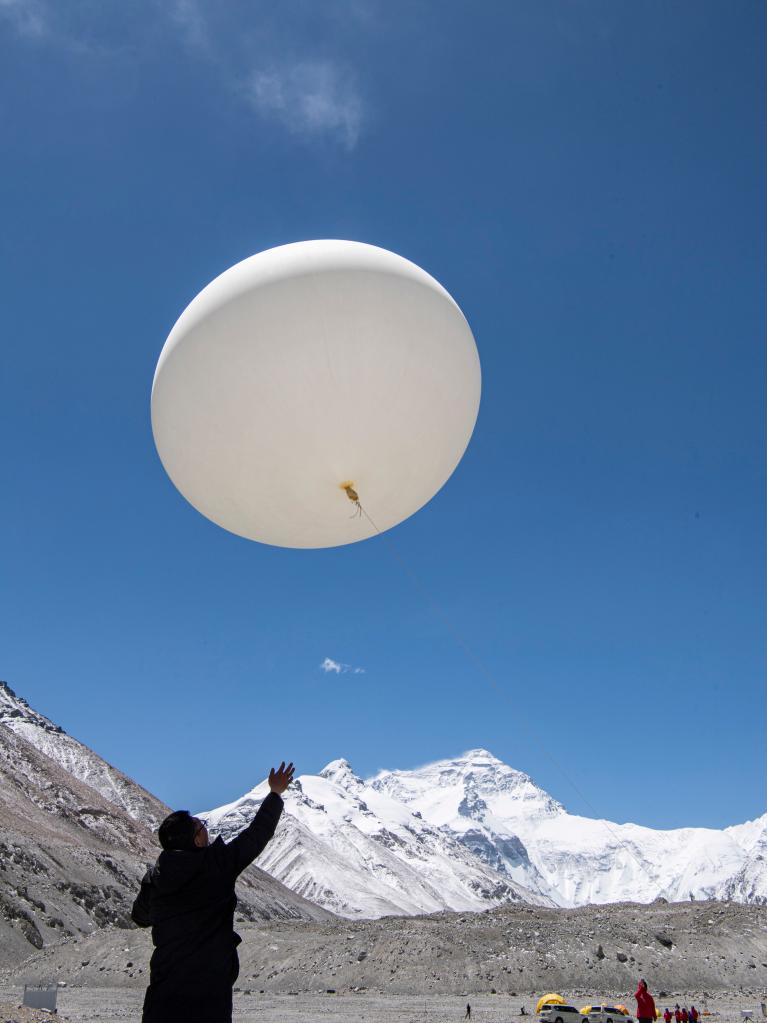 5月3日,在珠峰登山大本营,科研人员施放大气臭氧探空气球。新华社记者 孙非 摄