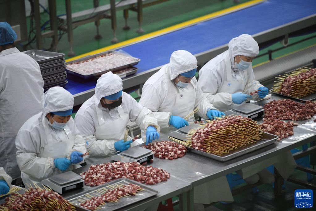 盐池滩羊产业发展集团工人在流水线上分拣羊肉(5月2日摄)。