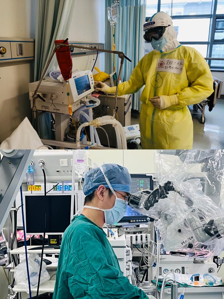 拼版照片:上图为吴超在武汉抗疫时工作照,下图为吴超近期工作照。