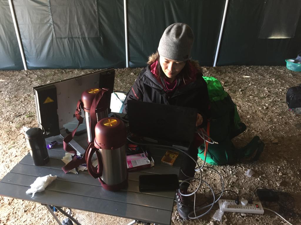 2017年6月,记者在青藏科考色林错营地帐篷里写稿。