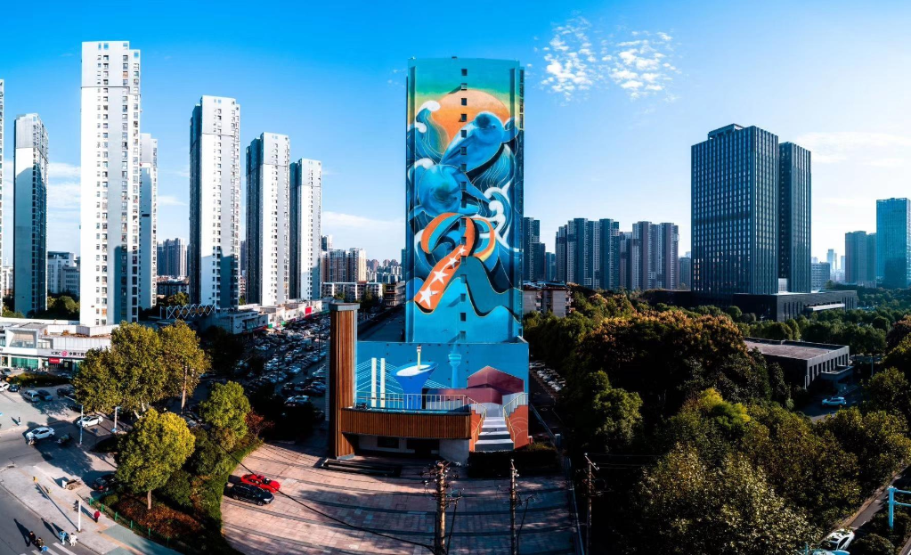 2019年,团队抓住老旧小区居民楼改造的机会,主动申请,拿着设计手稿向市民征询意见,最终把游动的江豚搬上了约200平方米的楼面。此后,他们陆续创作了多幅以江豚为主题的壁画,有的高达60米。“江豚萌萌的笑脸惹人喜爱,我在长江边长大,画江豚也是为了传递保护野生动物、保护长江生态的理念。”张浩说。