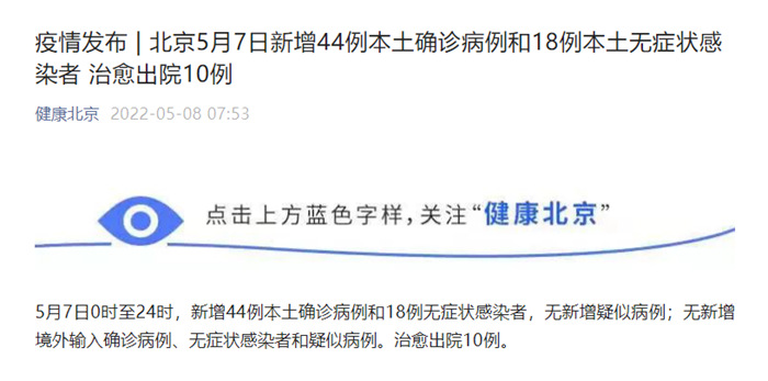 确诊病例44:现住通州区如意园。5月7日诊断为确诊病例,临床分型为轻型。