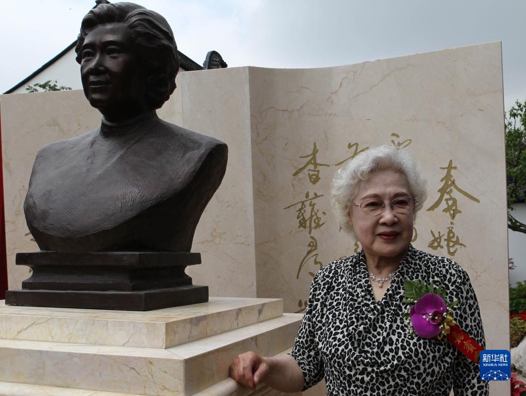 2011年5月27日,秦怡艺术馆在秦怡的故乡——上海闵行区浦江镇揭幕。这是揭幕当天,秦怡在她的塑像前留影。新华社记者 任珑 摄