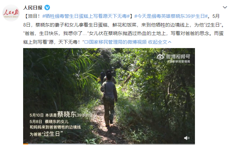 5月8日,蔡晓东的妻子和女儿拿着生日蛋糕、鲜花和饭菜,来到他牺牲的边境线上,为他“过生日”。“爸爸,生日快乐,我想你了……”女儿伏在蔡晓东抛洒过热血的土地上,写着对爸爸的思念。而蛋糕上则写着“愿,天下无毒!”