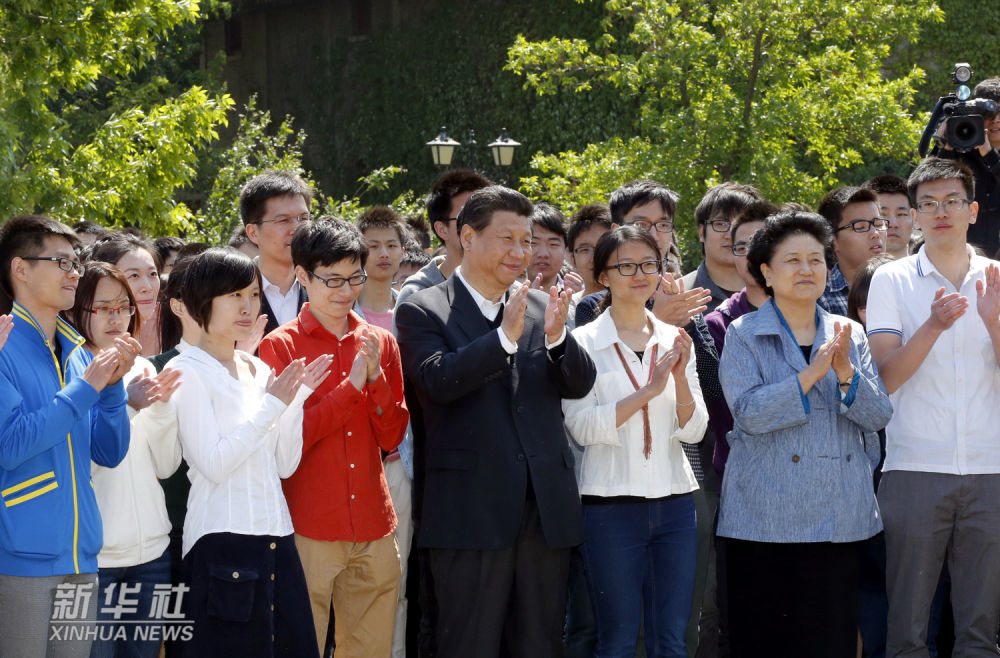 ↑2014年5月4日,习近平在北京大学考察。这是习近平在校园观看北大师生纪念五四运动95周年青春诗会。