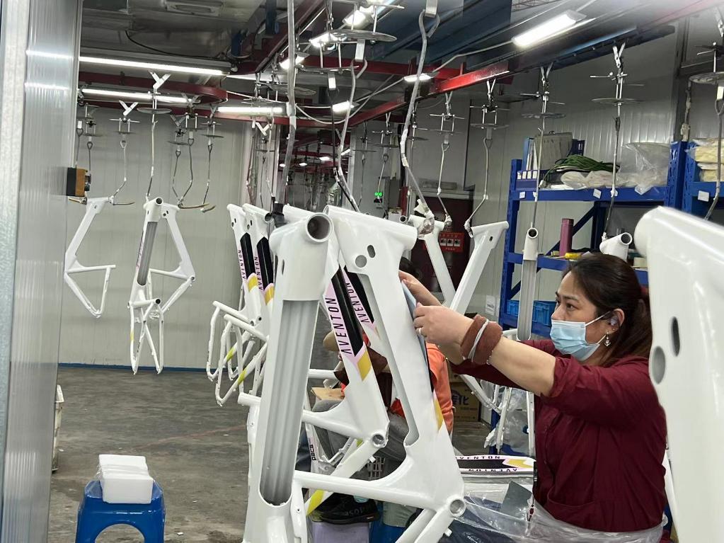 工人在为塑型好的车架贴膜。受访企业供图