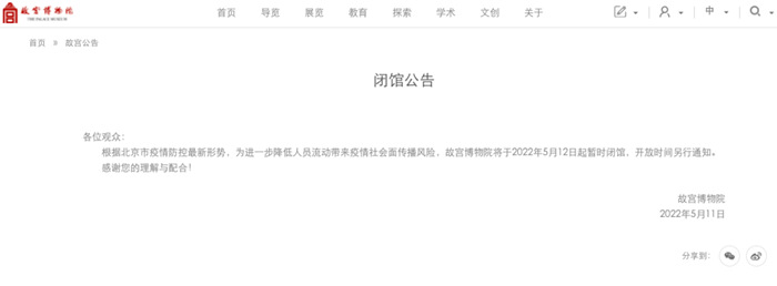 根据北京市疫情防控最新形势,为进一步降低人员流动带来疫情社会面传播风险,故宫博物院将于2022年5月12日起暂时闭馆,开放时间另行通知。