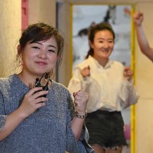福建厦门创业台青朱慧宁(左一)与她的主播们在直播后一起加油鼓劲(资料图片)。新华社记者 魏培全 摄