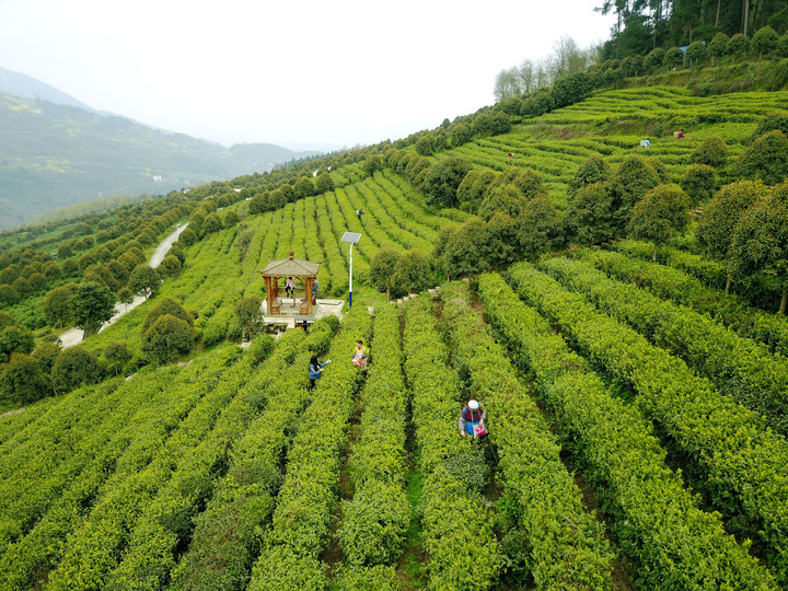 茶农在贵州省正安县三把车茶园采摘正安白茶(2017年3月29日摄,无人机照片)。新华社记者 陶亮 摄