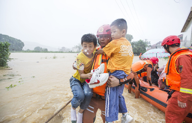 2020年7月8日,消防救援人员在江西省九江市都昌县鸣山乡石峰村转移被洪水围困的群众。