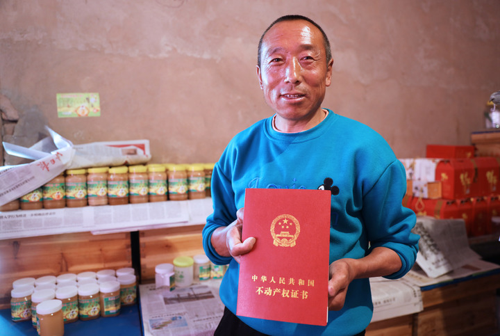宁夏固原市彭阳县米塬村蜂农米克宗展示山林权不动产权证书(4月20日摄)。新华社记者 卢鹰 摄