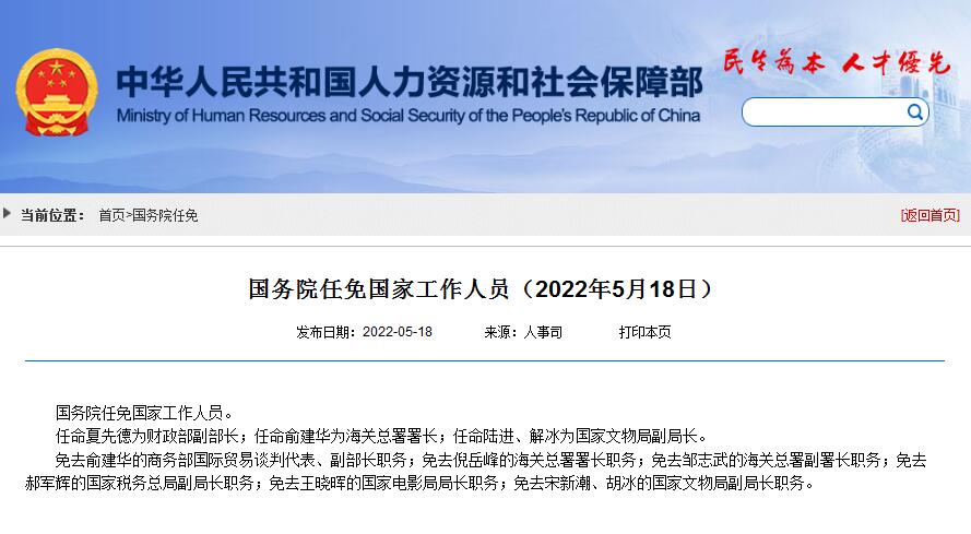 任命夏先德为财政部副部长;任命俞建华为海关总署署长;任命陆进、解冰为国家文物局副局长。
