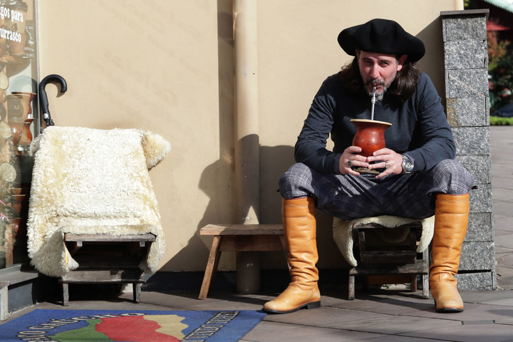 ↑5月12日,在巴西南大河州格拉马杜,一名商店店员来到路边享用马黛茶。新华社发(卢西奥·塔沃拉 摄)