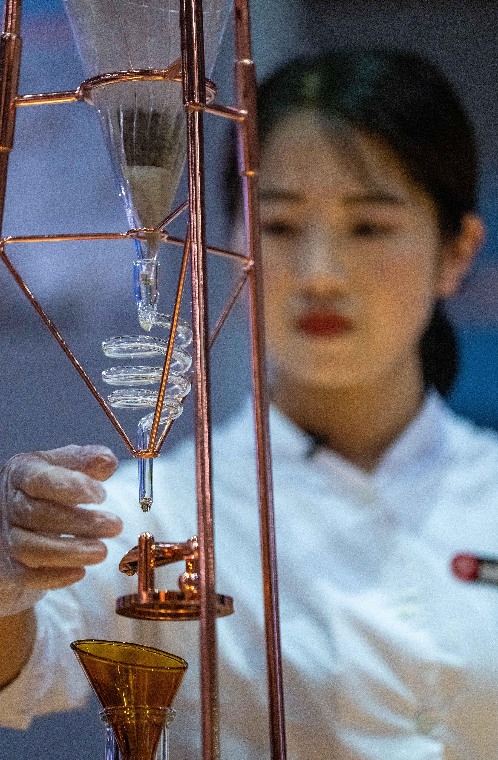↑云南勐海大益茶庭的茶艺师陈夷在制作冰滴普洱茶(5月10日摄)。新华社记者江文耀摄