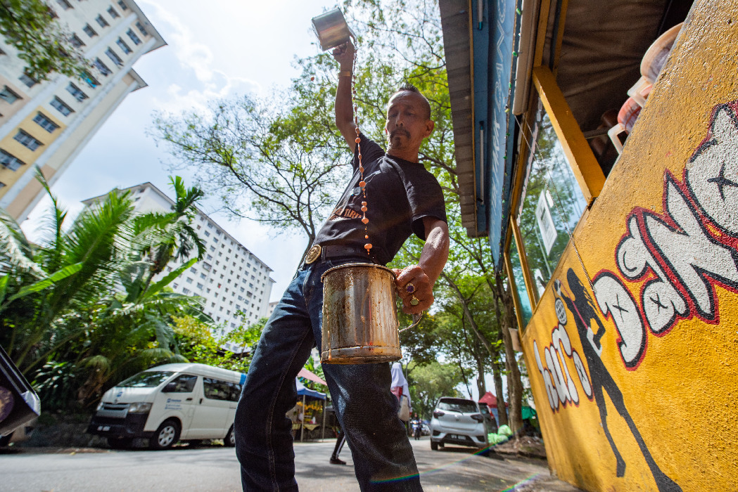 ↑5月18日,在马来西亚雪兰莪州的必打灵查亚,穆赫德·扎布里在制作拉茶。新华社发(张纹综摄)