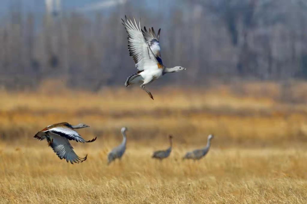 在北京野鸭湖湿地拍摄到的大鸨与灰鹤