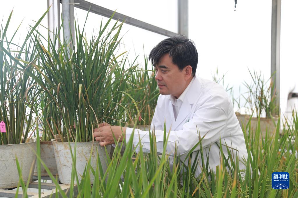 中国工程院院士、湖南省农业科学院党委书记柏连阳在实验室查看水稻生长情况(资料照片)。新华社发(受访者供图)