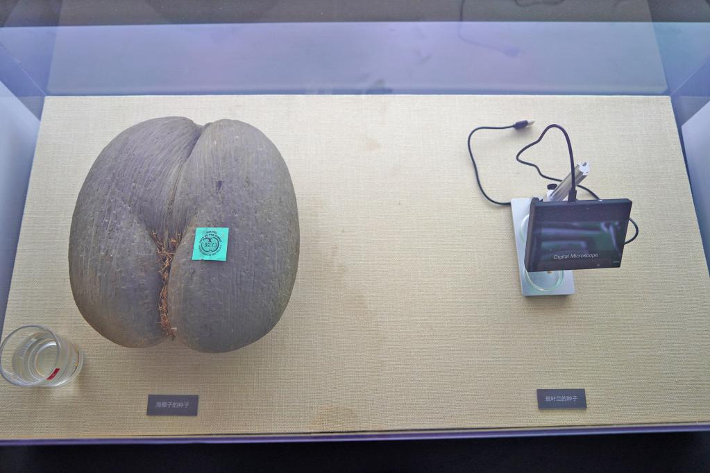 海椰子的种子(左)与斑叶兰的种子。(国家植物园供图)
