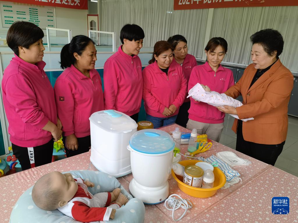 卓长立(中)指导正在接受培训的家政服务员(2021年6月2日摄)。新华社发