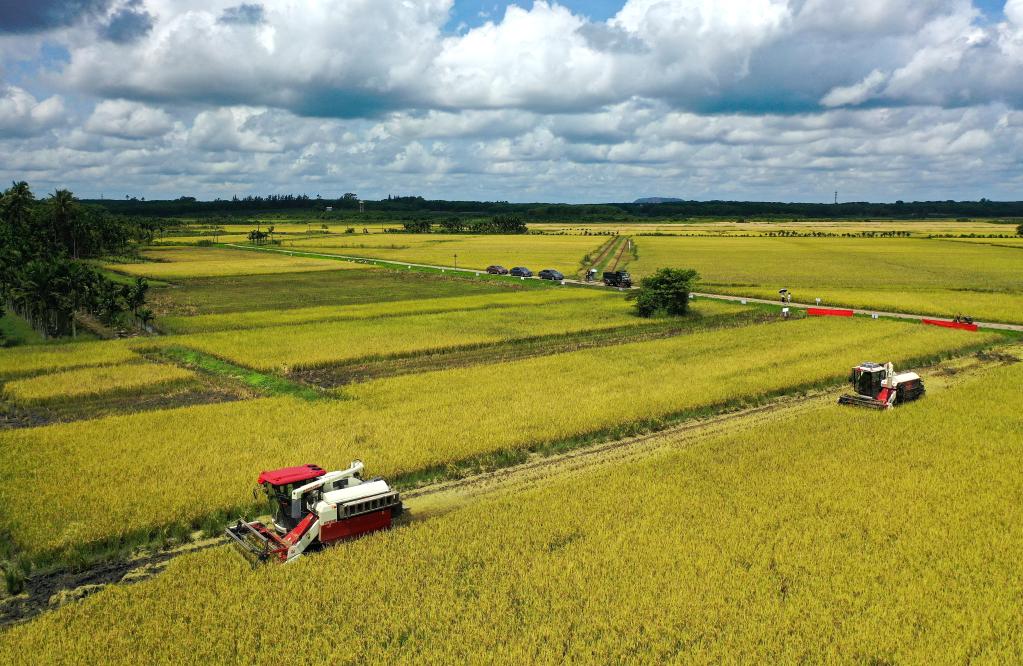 2022年5月21日,收割机在海南省海口市红旗镇墨桥村的稻田作业(无人机照片)。新华社记者郭程摄