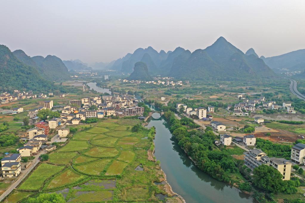 2022年4月11日,广西桂林市阳朔县遇龙河沿岸山清水碧,宛如一幅山水田园画卷(无人机照片)。新华社记者 周华 摄