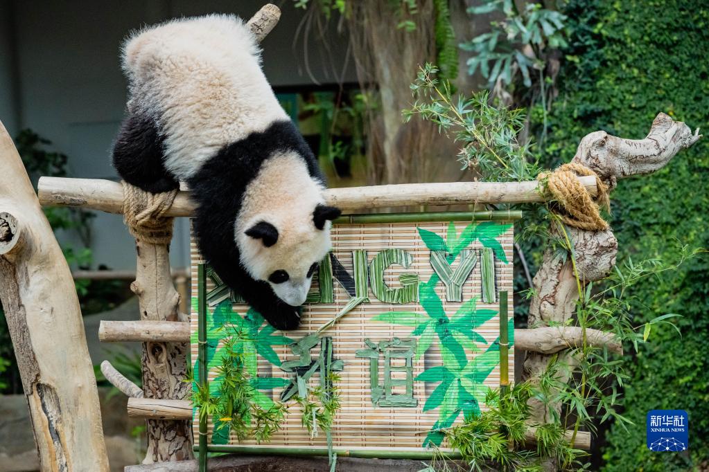 5月25日,大熊猫宝宝“升谊”在马来西亚吉隆坡附近的国家动物园玩耍。新华社记者 朱炜 摄