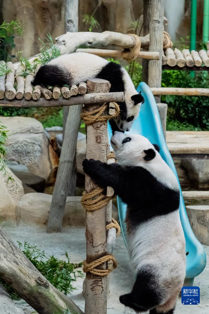 5月25日,大熊猫宝宝“升谊”(上)和妈妈“靓靓”在马来西亚吉隆坡附近的国家动物园玩耍。新华社记者 朱炜 摄