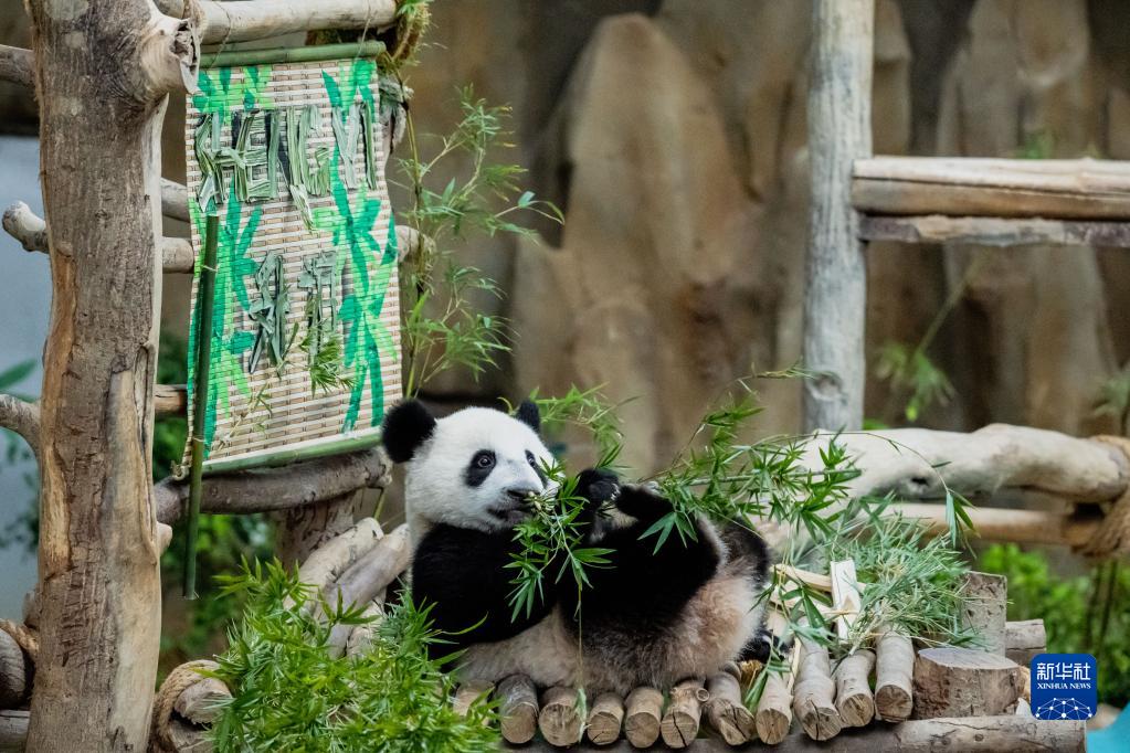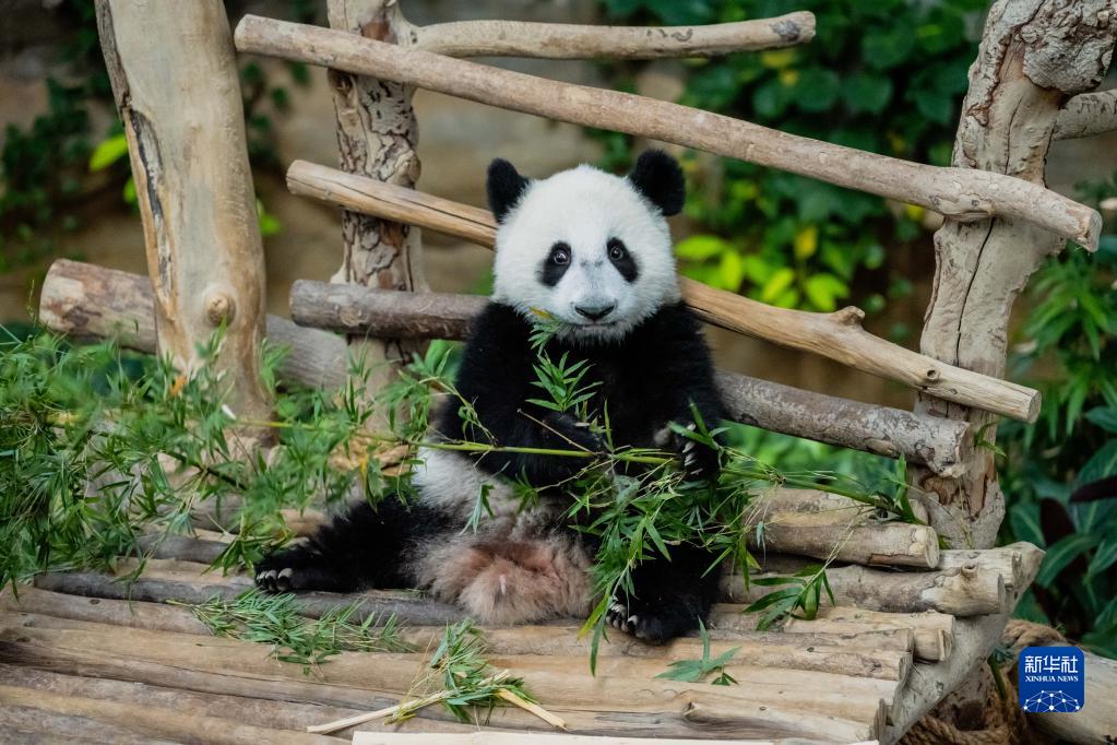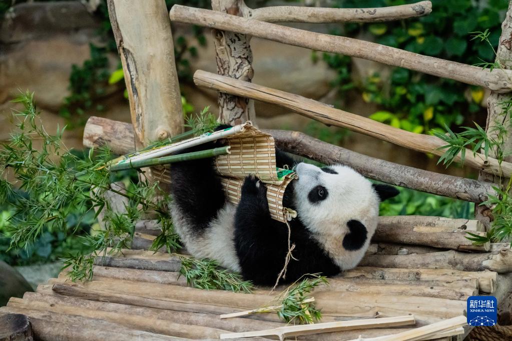 5月25日,大熊猫宝宝“升谊”在马来西亚吉隆坡附近的国家动物园吃竹子。新华社记者 朱炜