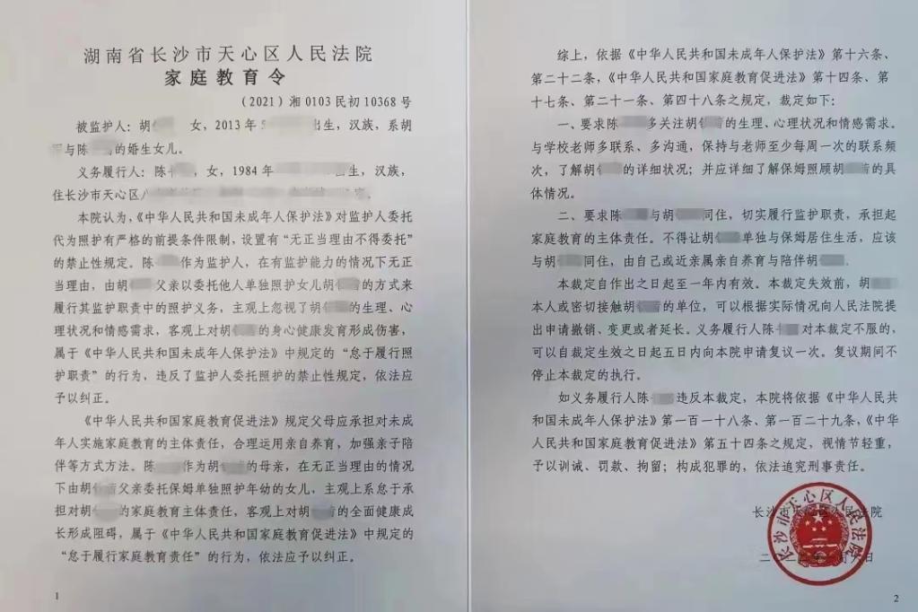 1月6日,一位母亲从长沙市天心区人民法院审判员手中接过一份裁定。这是家庭教育促进法1月1日施行后的全国首份家庭教育令。