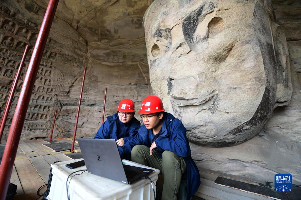 5月11日,在云冈石窟第17窟,工作人员在分析采集到的石窟数据信息。新华社记者 杨晨光 摄
