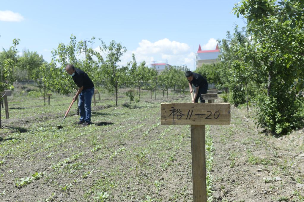 公司生产厂房外,工人正在红花品种试验田内忙碌。新华社记者高晗 摄