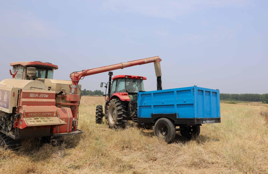 5月25日,在安徽省淮南市寿县小甸镇贾庄村,收割机正在将油菜籽装车。新华社记者 曹力 摄