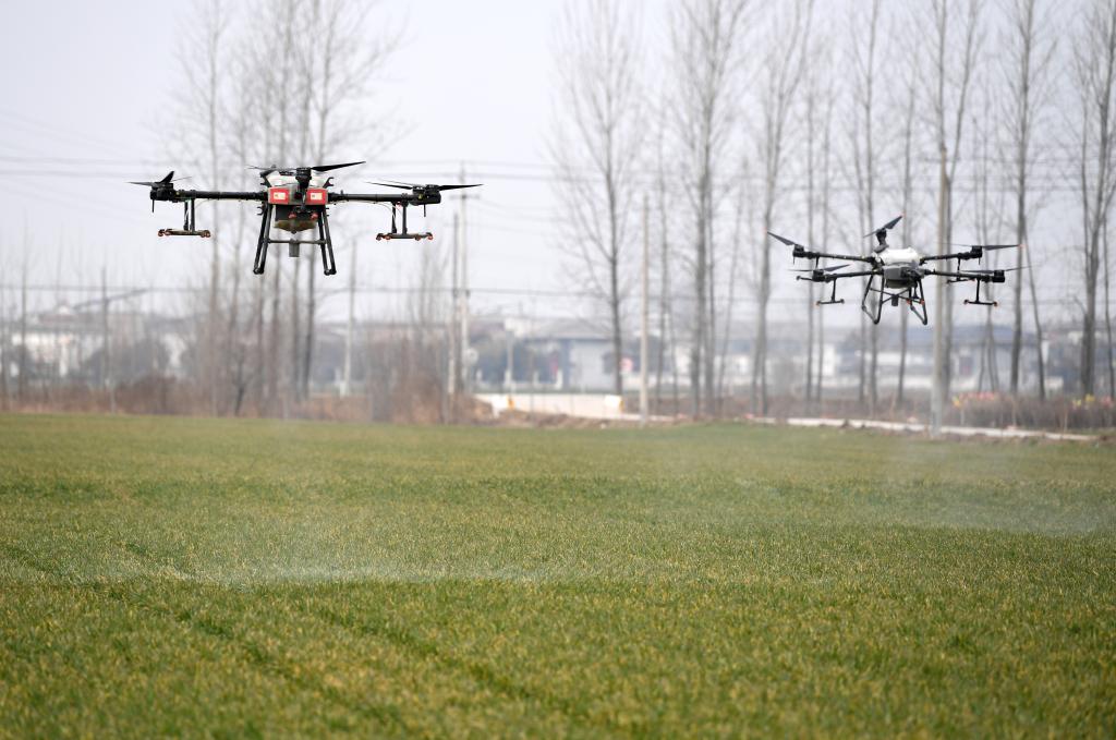 2月11日,无人机在安徽省亳州市谯城区赵桥乡“无人农场”喷洒除草剂。新华社记者 刘军喜 摄
