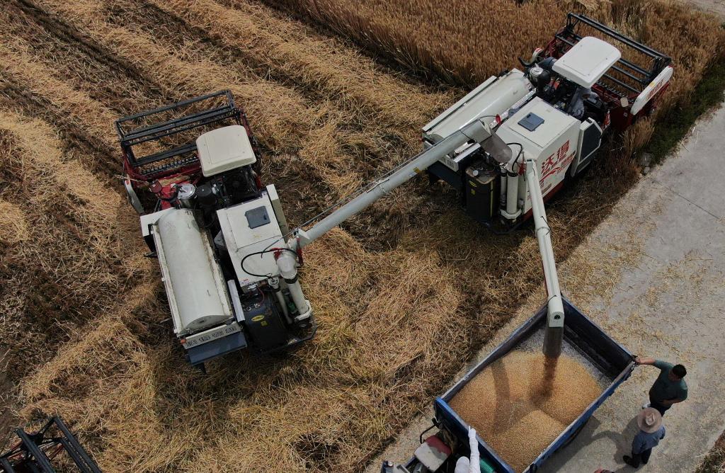 在位于安徽省安庆市宿松县境内的华阳河农场,收割机正在作业中。新华社发(李龙 摄)