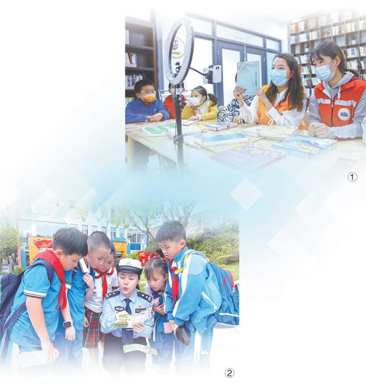 图①:江苏省如皋市如城街道联合爱行动实践中心,走进当地顾庄社区农家书屋,通过“线上+线下”方式开展“爱阅护苗”主题公益课堂活动。图为志愿者通过网络平台为学生推荐好书。徐 慧摄 图②:四川省达州市公安局交警支队组织警力深入学校开展普法活动,通过灵活有趣的互动学习,提升孩子们的安全和法治意识。图为交警与孩子们交流。代 婵摄