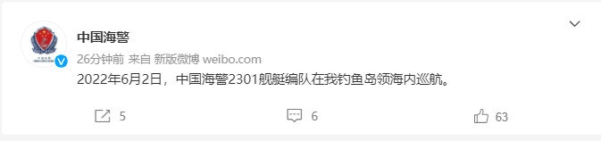 2022年6月2日,中国海警2301舰艇编队在我钓鱼岛领海内巡航。