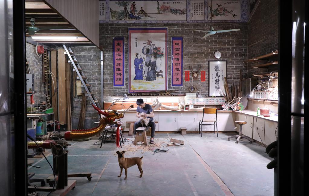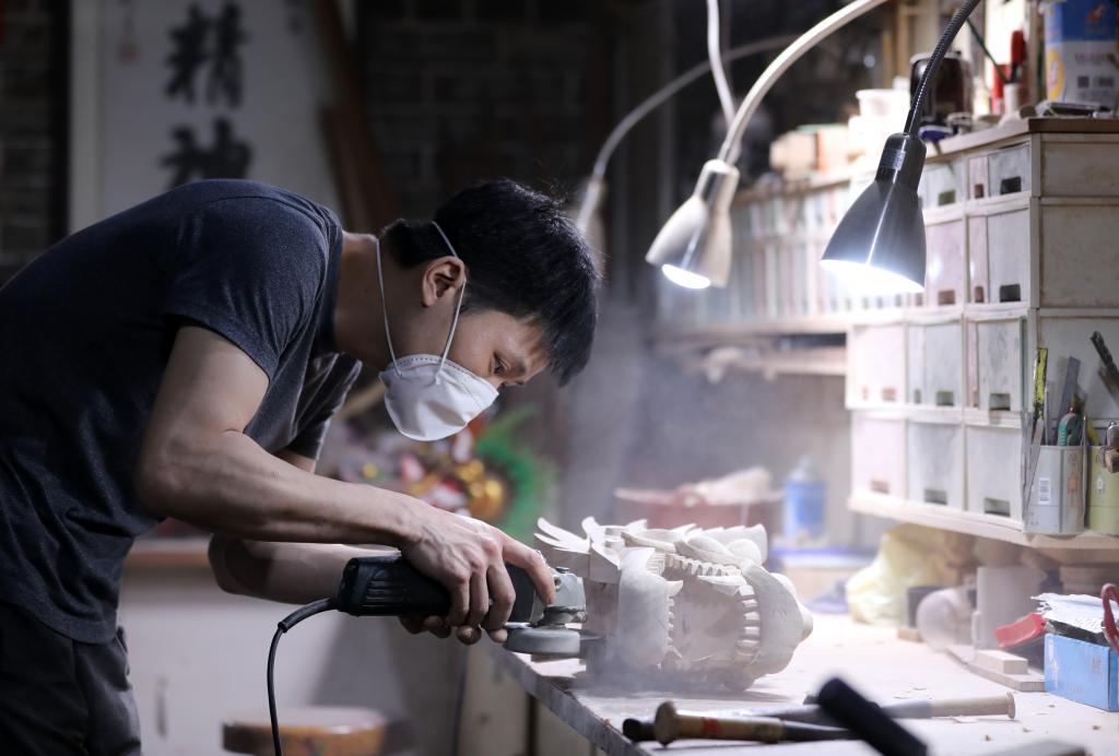 张伟潮在工作室雕刻龙头。新华社记者黄国保 摄