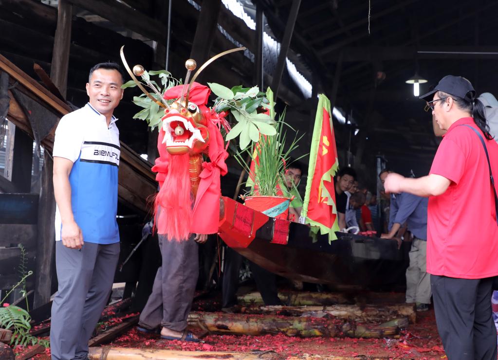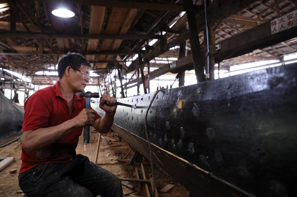 新的船身以进口的坤甸木打造,长度39.2米,比老龙船长10厘米左右。“按照村里习俗,每造一条新龙船都要长一点,寓意长长久久、生生不息。”黄剑挺说,新“东坡号”厚度相比之前增加了一倍,这也是他经手过最重的龙船。