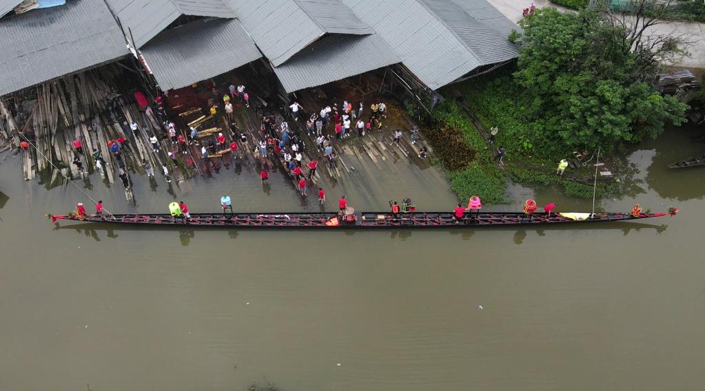 点睛仪式过后,伴随着鼓声与呐喊声,乌黑亮泽的新“东坡号”被合力从船厂推出,正式骏水,经由珠江河道缓缓驶向车陂村。村民们早已在河边等待,见证这一难得的游龙盛景。