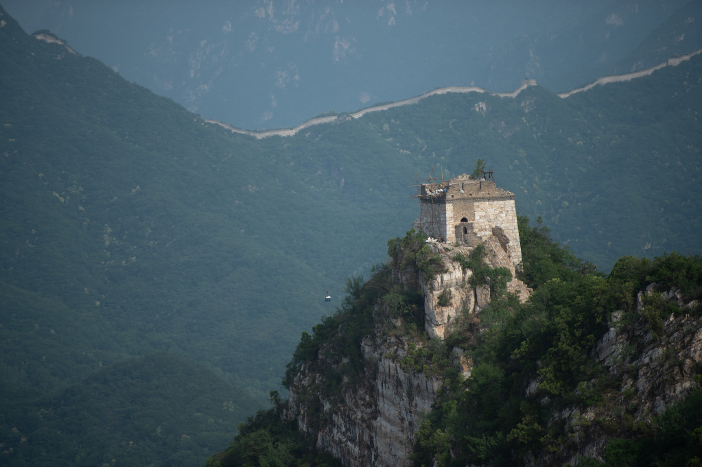 2020年6月11日,工人在箭扣长城一处敌楼上使用索道运输物资。新华社记者陈钟昊 摄